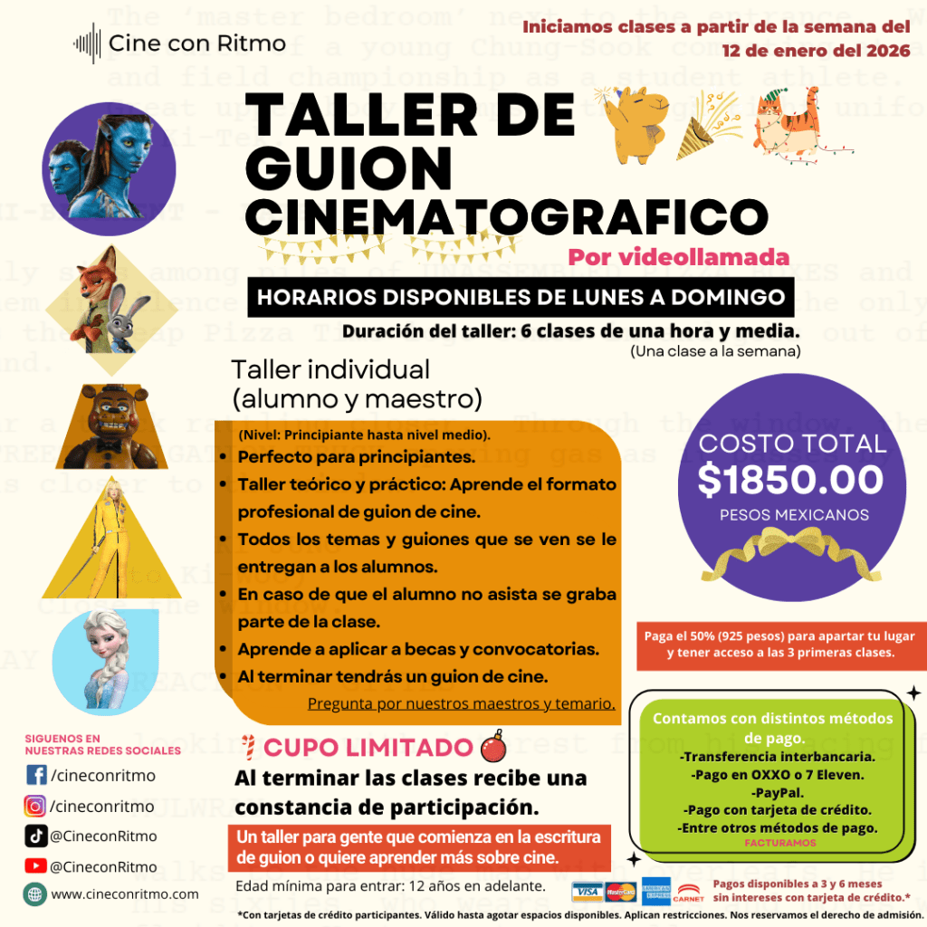 Taller de guion grupal de 8 clases de tres horas. En Guadalajara, Jalisco. Inicio: Sábado 17 de enero 2026