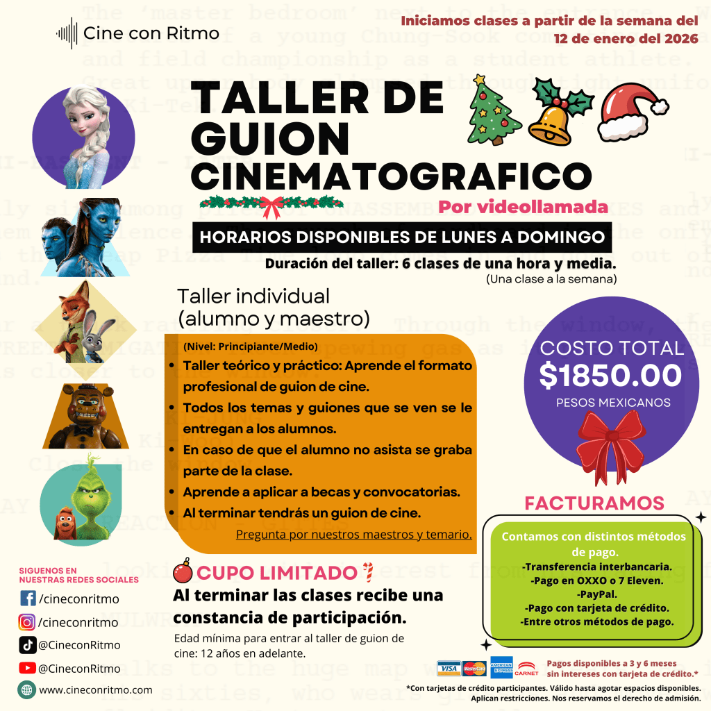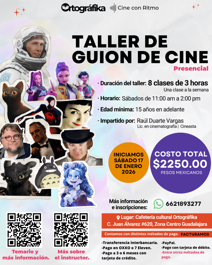 Taller de guion grupal de 8 clases de tres horas. En Guadalajara, Jalisco. Inicio: Sábado 17 de enero 2026