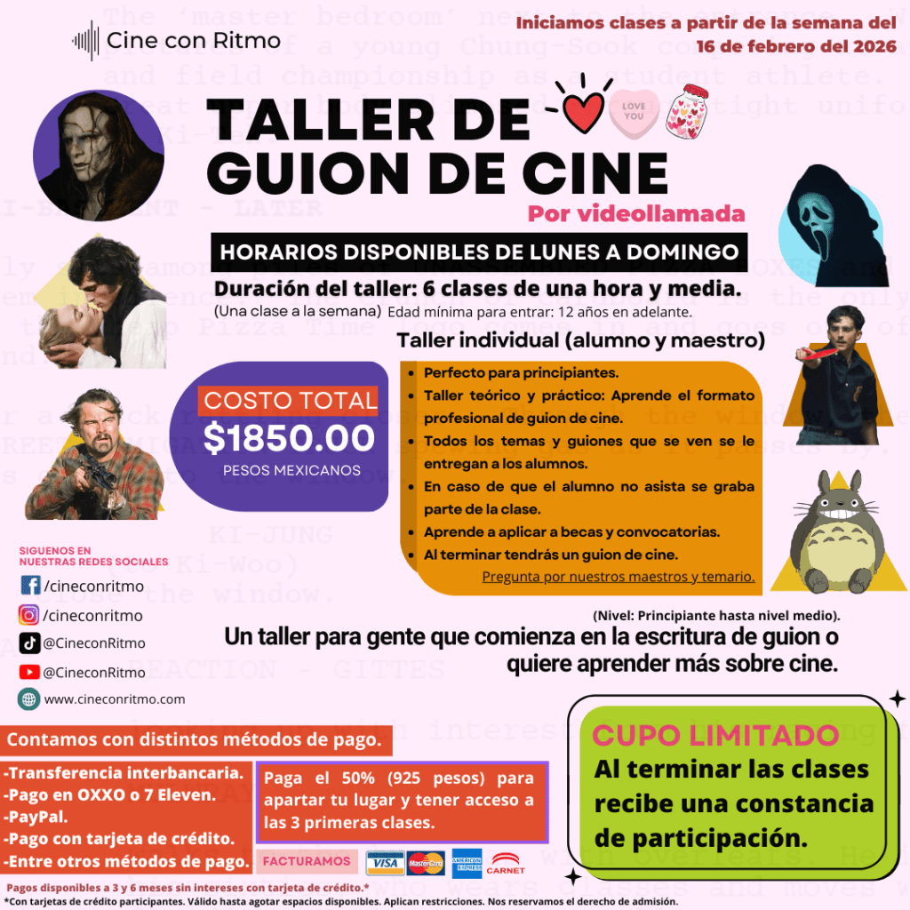 Taller de guion grupal de 8 clases de tres horas. En Guadalajara, Jalisco. Inicio: Sábado 14 de marzo 2026
